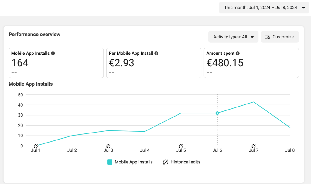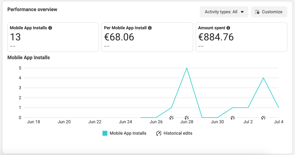 - Через невеликий розмір аудиторій кампанія отримала обмежену кількість показів і досить високий CPM – €12-15. Перші встановлення обійшлися в €143.