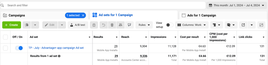 - Паралельно ми запустили кампанію Advantage+ app iOS 14+ campaign, що автоматично обирає аудиторію та плейсменти на основі індивідуальних оптимізованих налаштувань. Вже за перші три дні роботи кампанії ми отримали ціну €4.66 за встановлення.