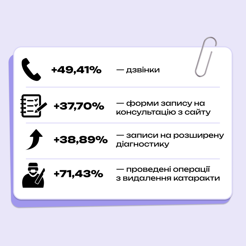 Стратегічними акцентами в рекламних кампаніях було просування основного напряму — операцій з лікування катаракти. Також ми почали створювати точку довіри, демонструючи експертність провідної лікарки-офтальмологині Наталії Михайлівни Пустовіт. Розробили й запустили окремі стратегії та рекламні меседжі для міста Черкаси та райцентрів області, зважаючи на різну логіку ухвалення рішення.